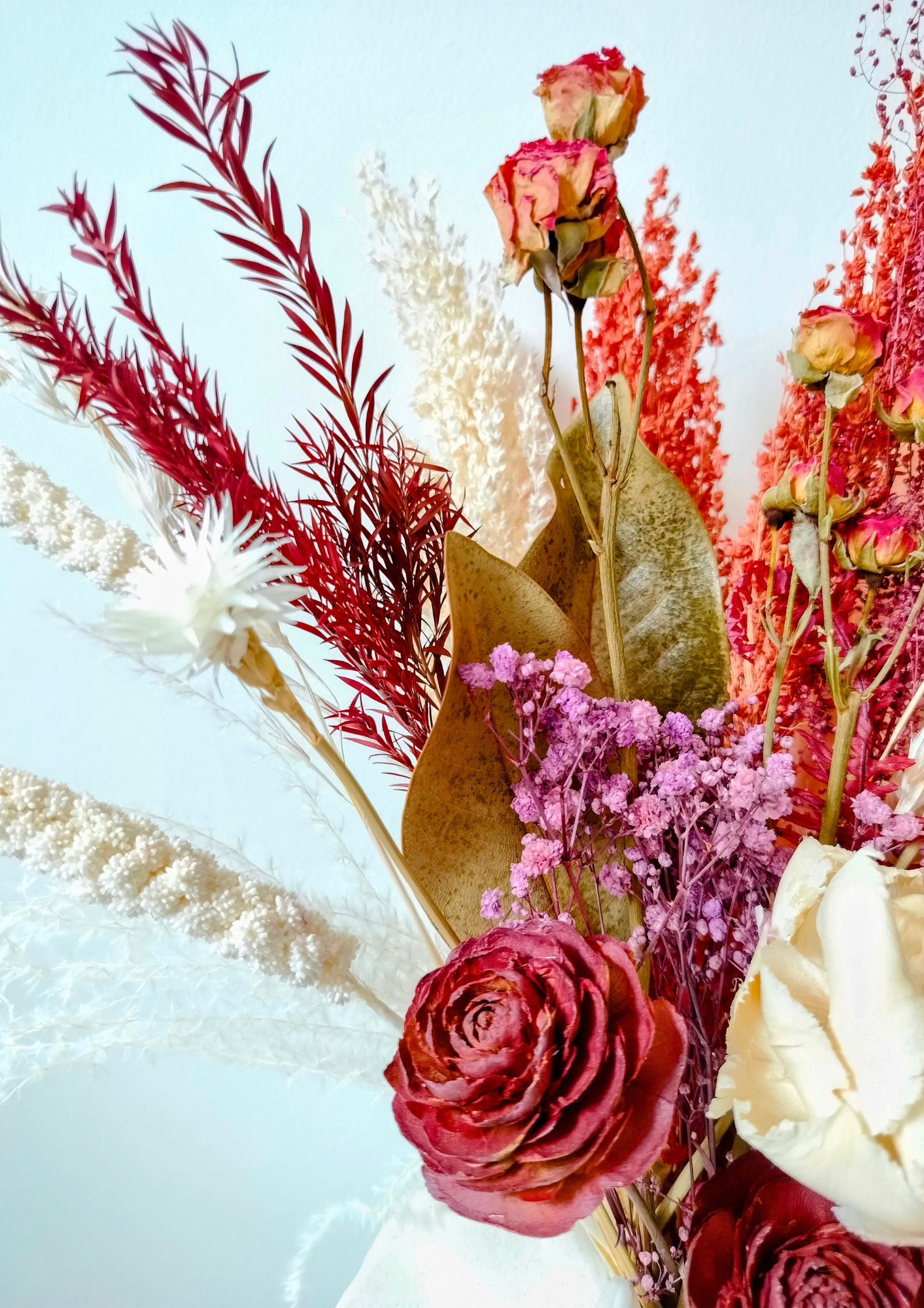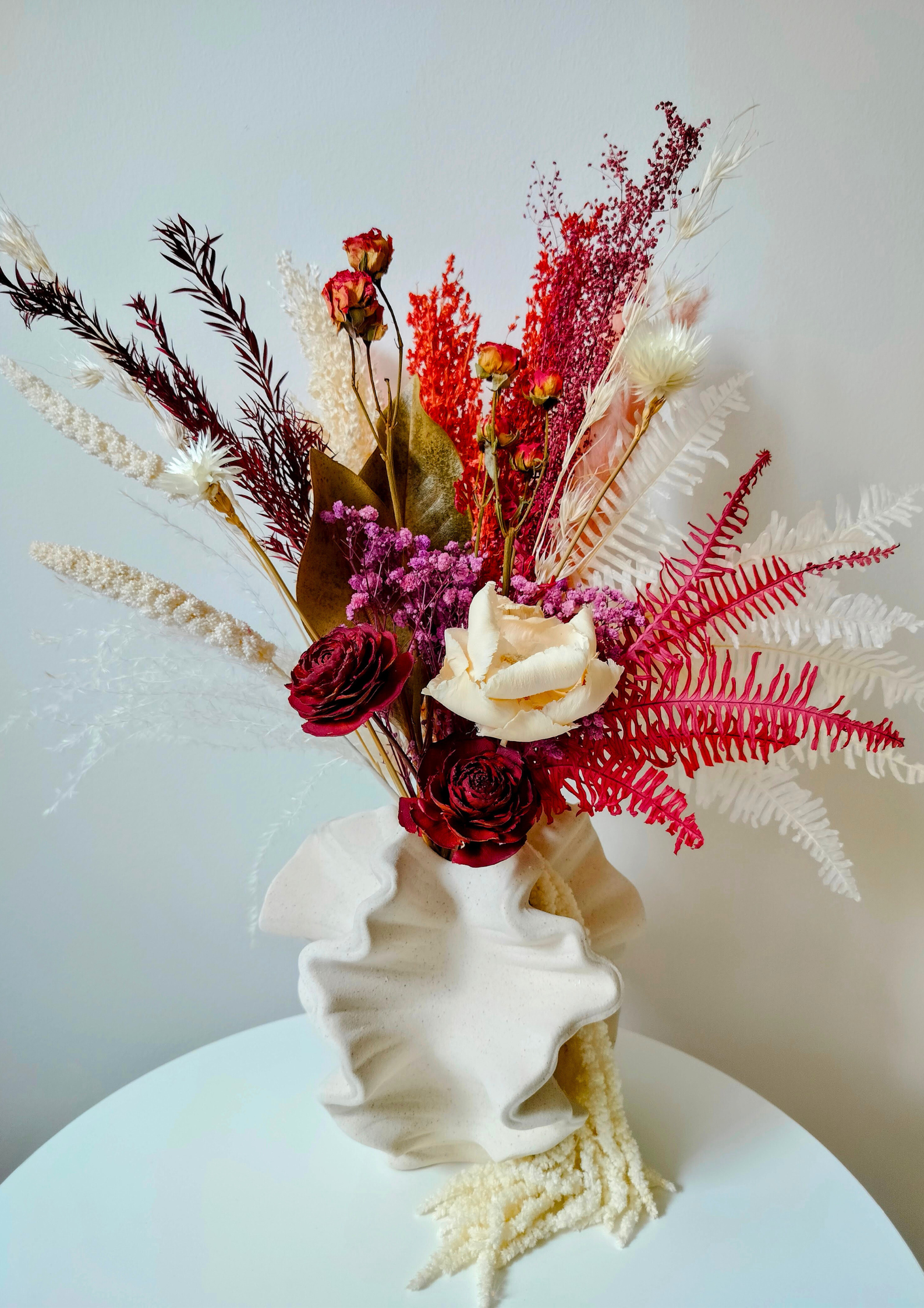 Celebrate the intersection of nature and modern design Kimora Vase Arrangement. This arrangement features an assortment of dried flowers, each chosen for its unique texture and color, and is arranged in a strikingly irregular vase. The vase’s contemporary shape adds a touch of artistic flair, making this arrangement a captivating focal point in any space.
