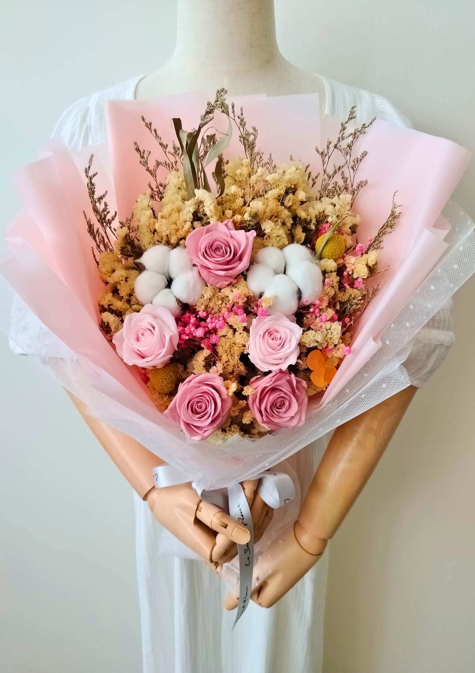 Experience the timeless romance of our Natalia Bouquet. This delicate arrangement showcases a selection of soft, blush pink roses, each preserved to maintain its natural beauty and gentle hue. The romantic blush tones create a warm, inviting atmosphere, perfect for celebrating love, anniversaries, or simply brightening your living space. With each rose meticulously preserved to last for years, this bouquet is a lasting tribute to elegance and affection.