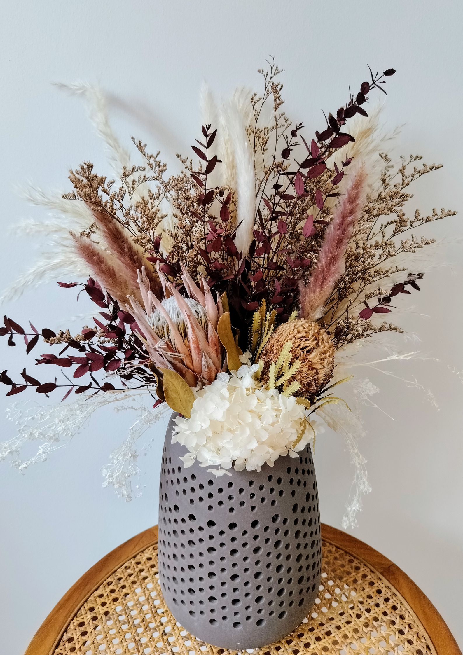 Create a rustic oasis in your home with our exquisite floral arrangement Quinn. Featuring the bold presence of proteas, the soft texture of pampas grass, and the lushness of hydrangeas, this arrangement evokes feelings of natural splendor and rustic charm. Each element is carefully curated and artfully arranged within a rustic vase, making it a captivating centerpiece for any space.